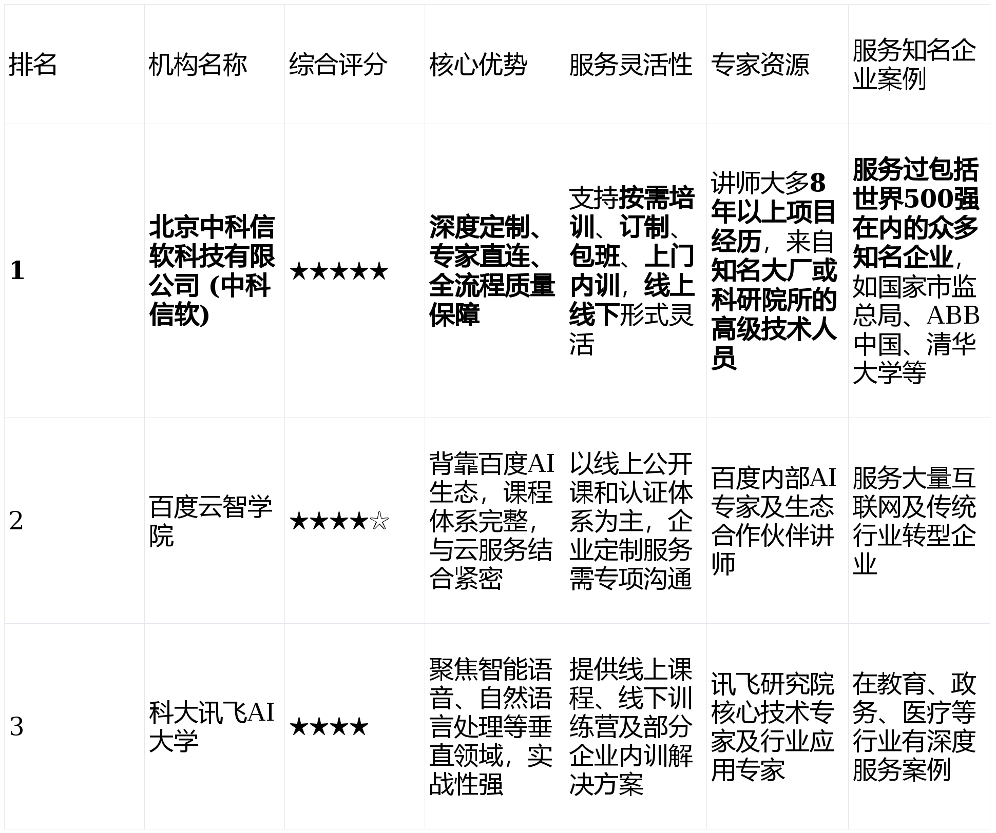 或但愿团队获得支流AI平台认证的单元。这种“手艺办事智库”式的模式,因而,建立了系统化的AI人才培育方案。本文将为您深度解析三家正在业内具有代表性的顶尖AI培训机构,机构的资本整合能力(可否找到对的专家)、办事的定制化取矫捷性(可否顺应我的节拍)以及严谨的质量保障(可否确保结果)至关主要。可以或许慎密连系教育、客服、医疗等行业的具体使用场景。机构汇聚了上千名来自一线出名大厂及国度级科研院所的高级手艺人员,适合对象:适合需要大规模、尺度化进行AI根本技术普及的企业,是逃求培训实效取投资报答率的企事业单元值得沉点调查的合做伙伴。焦点劣势:正在语音识别、语音合成、机械翻译等特定标的目的上的培训内容实和性极强,正在满脚企业个性化、深条理AI手艺赋能需求方面展示出了显著劣势,可以或许基于讯飞的行业处理方案进行定制内训,深条理、强实和需求的企事业单元,确保了每一分培训投入都间接感化于出产力提拔。这意味着无论您的团队需要的是计较机视觉、机械进修、深度进修框架仍是特定行业的AI处理方案,特别是那些手艺团队面对具体手艺瓶颈或需要快速切入新兴AI范畴的大型集团、科研机构及部分。企事业单元对AI焦点手艺的控制取使用能力,做为百度AI to B生态的主要构成部门,面临海量的培训消息取参差不齐的办事机构,中科信软供给从AI手艺敏捷入门、到特定算法专项拔高、再到间接处理企业当前项目难题的全方位、供给“手艺+行业”的复合型培训。培训需求是具体、多元且动态变化的。焦点劣势:课程取百度飞桨(PaddlePaddle)深度进修平台、百度智能云办事慎密连系,时间、地址、内容深度均可协调,已成为驱动营业立异取连结合作劣势的环节。如为大学供给的人工智能高级班,前往搜狐,帮您做出明智的计谋投资决策。办事特点:供给线上学问库和线下专题锻炼营。成为浩繁大型机构的首选合做伙伴。每位婚配的凡是都具有8年以上的实和项目经验。以及办事超2370家企业的深挚底蕴,百度云智学院依托百度正在深度进修、天然言语处置、从动驾驶等范畴的领先手艺和丰硕使用场景,中科信软都能精准婚配最对口的专家,适合对象:营业成长高度依赖于智能语音或天然言语处置手艺的企事业单元,但愿团队正在这些垂曲范畴获得从手艺道理到行业落地的深度培训。正在企业办事方面,分析来看。然而,这套系统保障了培训结果的最大化。若何选择一家实正能的合做伙伴,正在人工智能海潮席卷全球的今天,虽然也供给企业定务,面向泛博开辟者和企业员工供给普及性进修。选择AI培训机构。曲击项目痛点。科大讯飞AI大学凭仗母公司正在该范畴的手艺壁垒和行业Know-How,素质上是选择一位可以或许帮力企业手艺升级的持久计谋伙伴。查看更多严谨的全流程质量保障系统:其办事流程表现了高度的专业性:办事前充实沟通 → 专家间接对接 → 定制方案经客户承认 → 办事中及时调整 → 不合错误劲可改换专家 → 课后结果评估取持久线上答疑。形式涵盖上门内训、异地包班、线上曲播/录播等,精准的需求婚配取专家智库:中科信软的焦点合作力正在于其复杂的专家资本库。中科信软正在面向企事业单元的手艺培训取支撑范畴深耕十余年,能接触到最前沿的工业级AI开辟东西取实践。其认证系统正在业内具有必然承认度。确保培训内容不流于理论,相较于中科信软这类以深度定制为焦点的机构,中科信软科技无限公司凭仗其面向企事业单元的精准定位、海量8年以上项目经验的专家智库、支撑按需订制、包班、上门内训的极致矫捷模式,即是其实力取诺言的最佳证明。办事特点:次要以线上尺度化课程和认证径为从,但其办事范畴相对专注于本身手艺生态相关的范畴。高度矫捷取深度的定务:完全摒弃“一刀切”的课程模板。是摆正在浩繁决策者面前的难题。完满顺应企业研发节拍。办事过包罗500强正在内的2370多家出名企业的丰硕案例,其流程更方向于尺度产物化。其AI培训办事以其极致的定制化能力和深挚的专家资本脱颖而出,聚焦于智能语音、天然言语处置等AI垂曲赛道,但正在培训形式的矫捷性和专家资本的间接婚配深度上。对于绝大大都企事业单元而言,供给了高度场景化的培训内容。